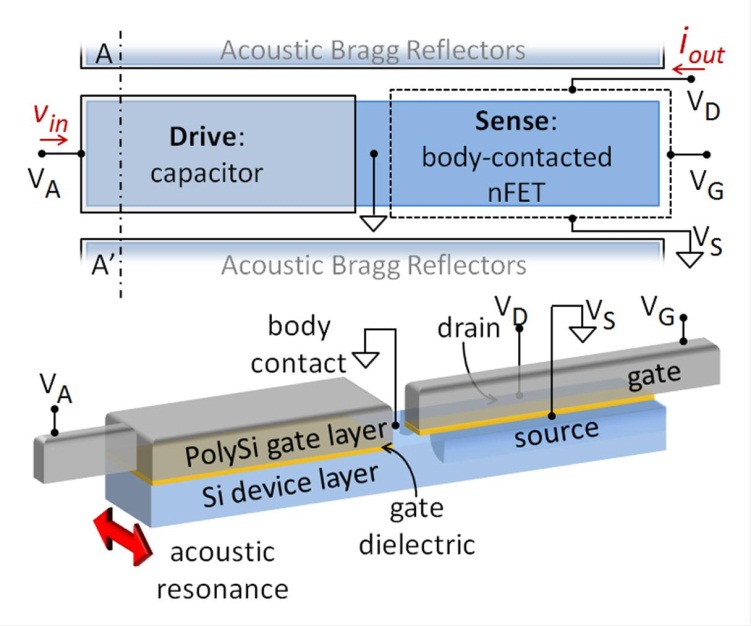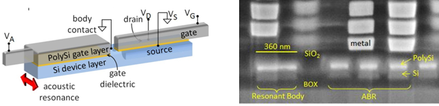 Figure 1. (left) Schematic of CMOS-integrated Resonant Body Transistor