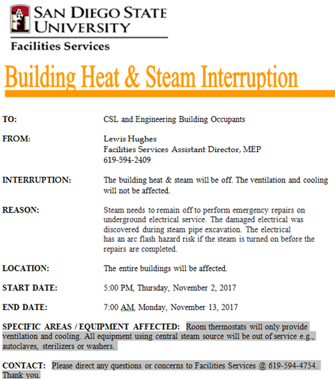 Subject: Fwd: Steam Interruption Notice CSL and Engineering Buildings