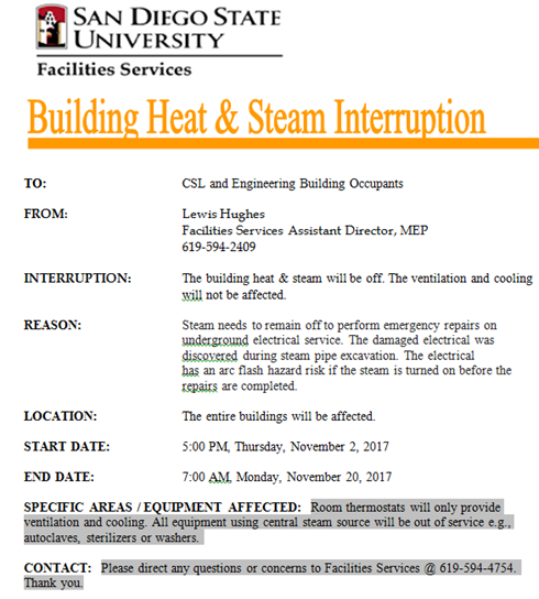 [Staff] FW: Steam Interruption Notice, Steam interruption is extended until November 20th.