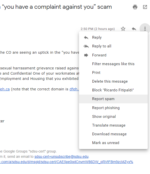 [Staff] Fwd: [sdsu-cert] Informational, Uptick on "you have a complaint against you” scam