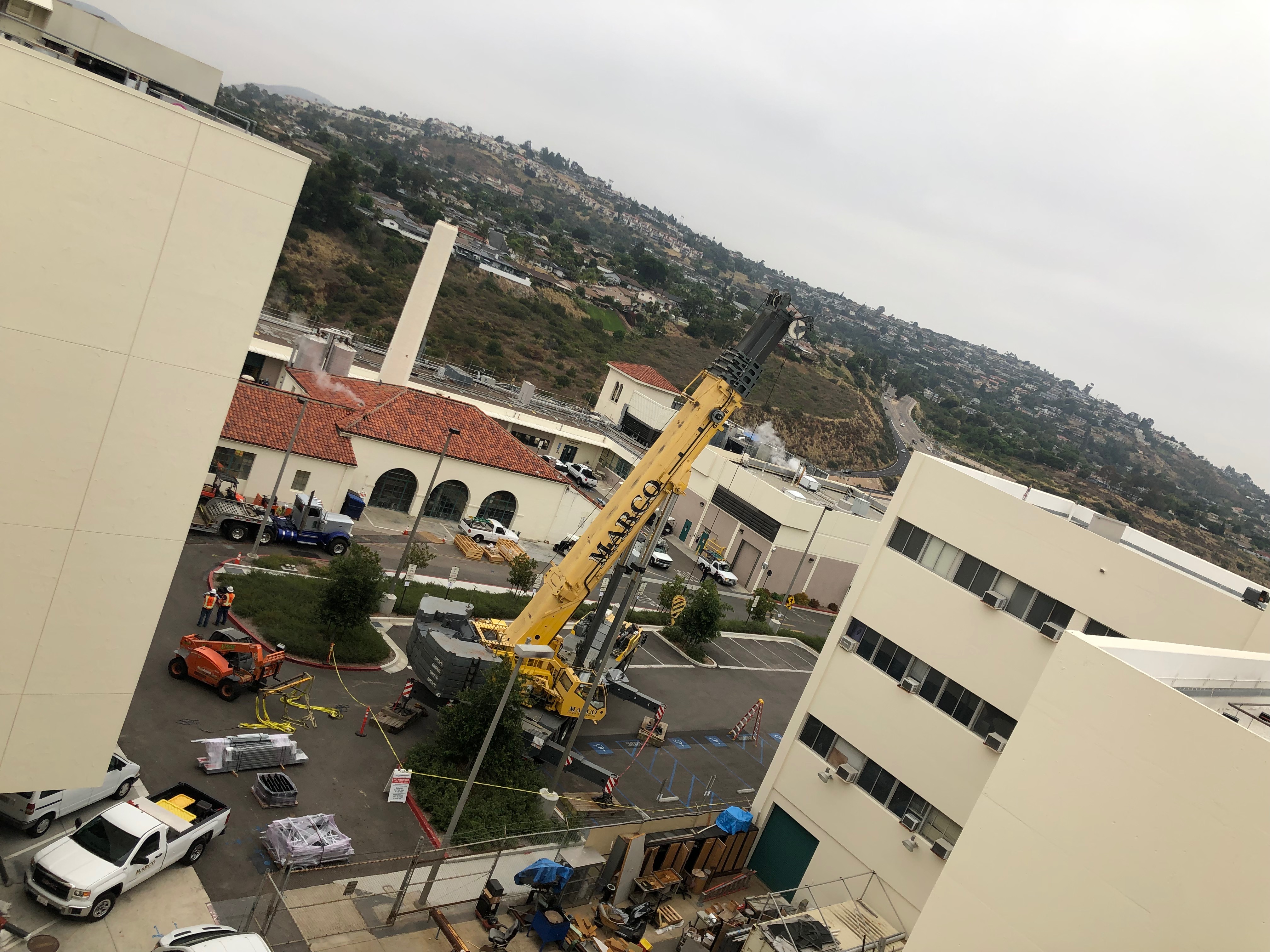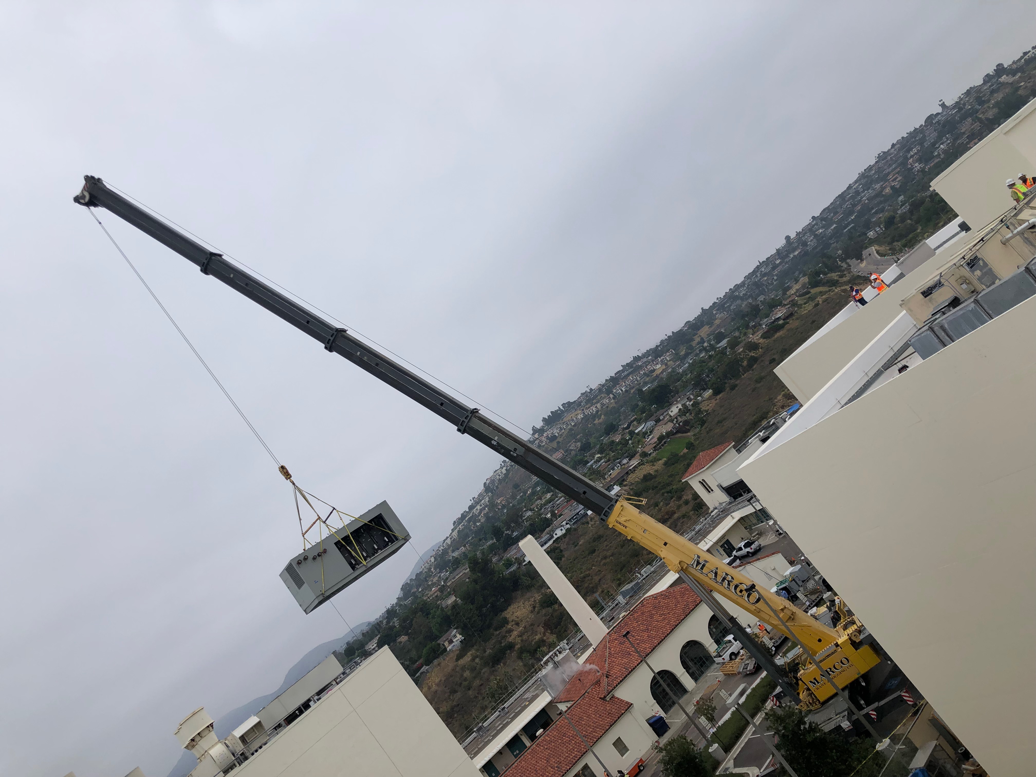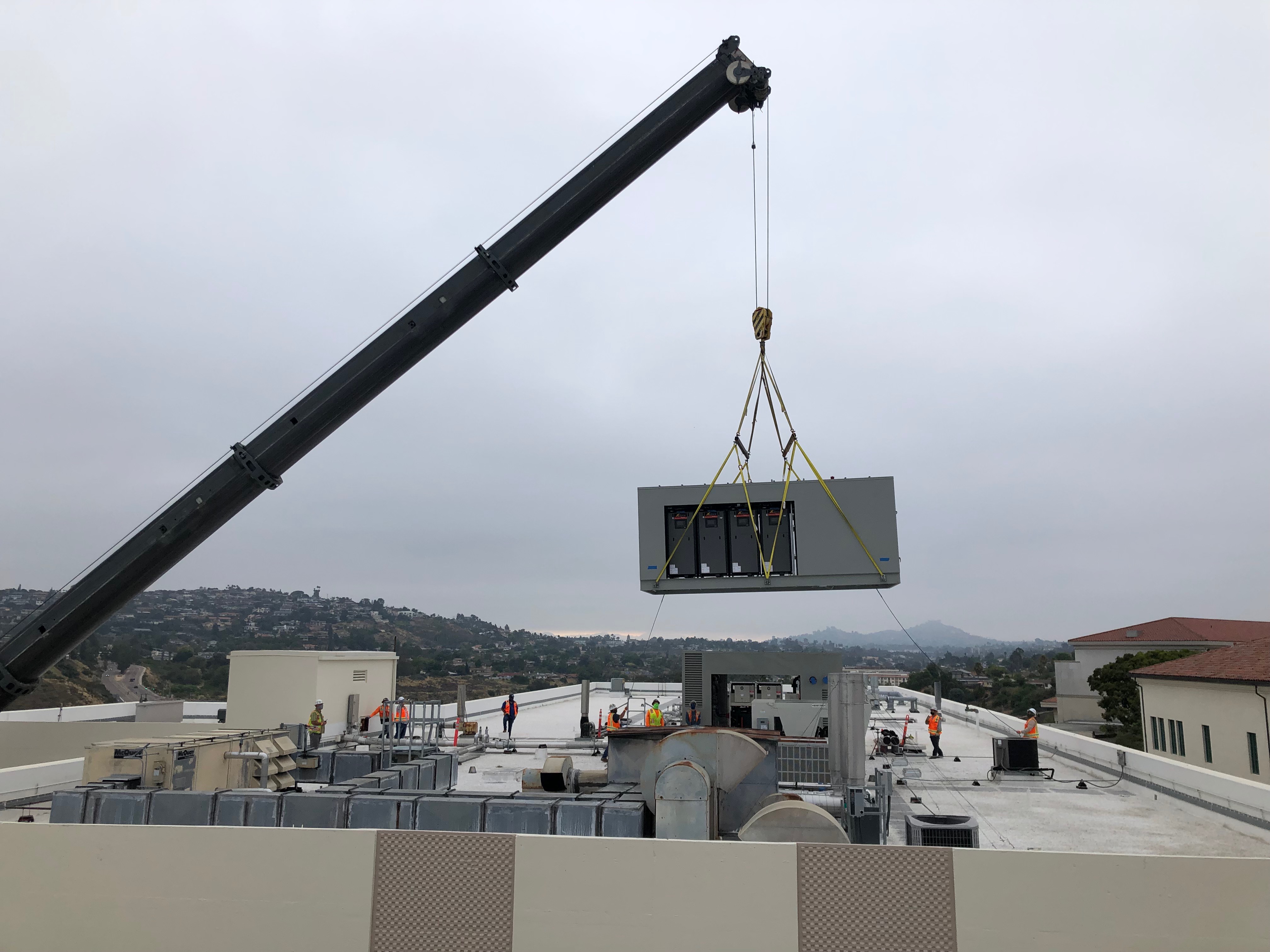 The crane lift of the new heat recovery chiller and boilers went according