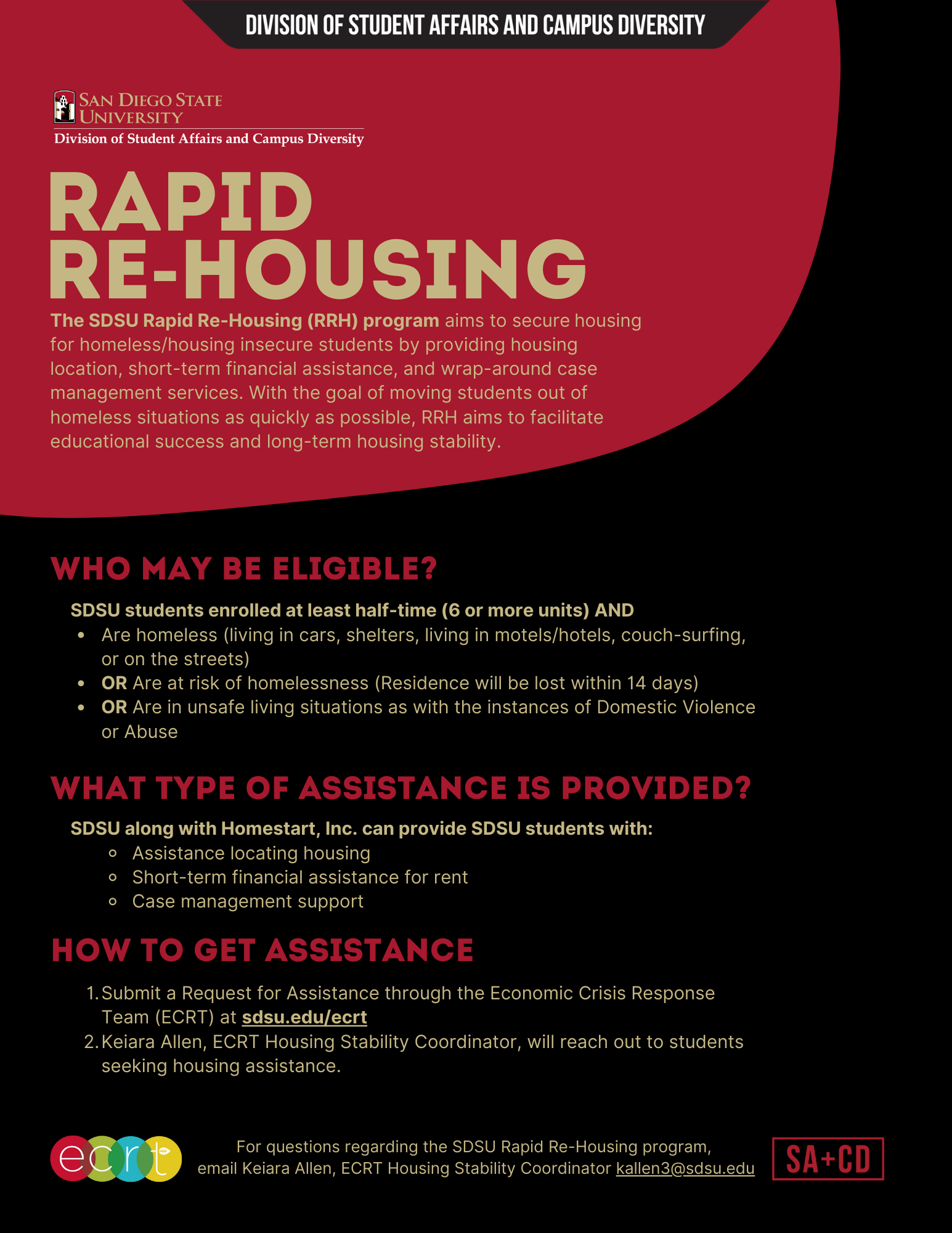 SDSU. This past year ECRT has launched a Rapid Re-Housing (RRH) program